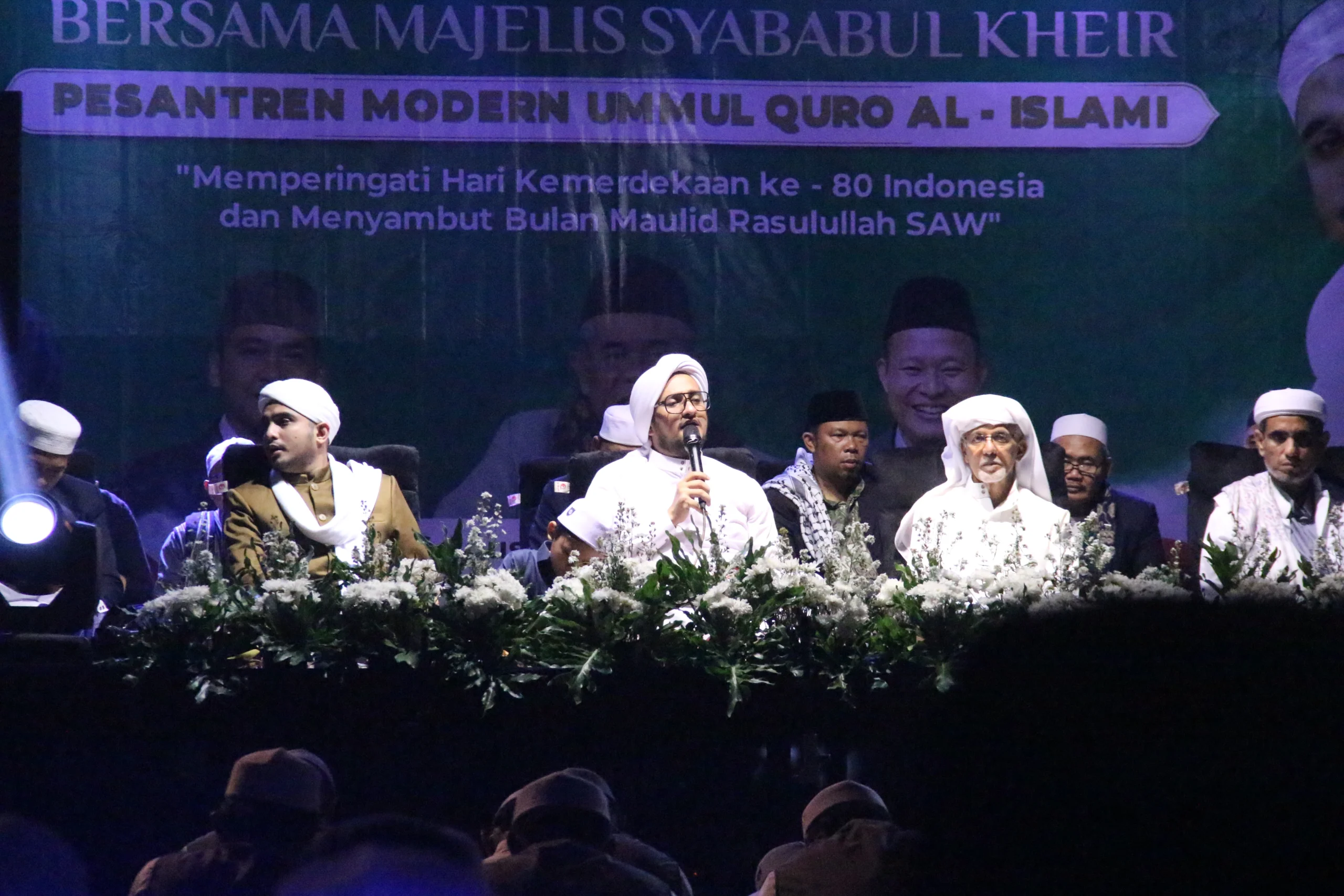 Pesantren Modern Ummul Quro Al-Islami (PMUQI) menggelar UQI Bershalawat bersama Majelis Syababul Khair di kompleks santri putra pada Sabtu malam (16/8/2025). Kegiatan untuk menyambut HUT ke-80 RI sekaligus bulan Maulid Nabi Muhammad SAW ini dihadiri santri, wali santri, masyarakat sekitar, serta para habaib.