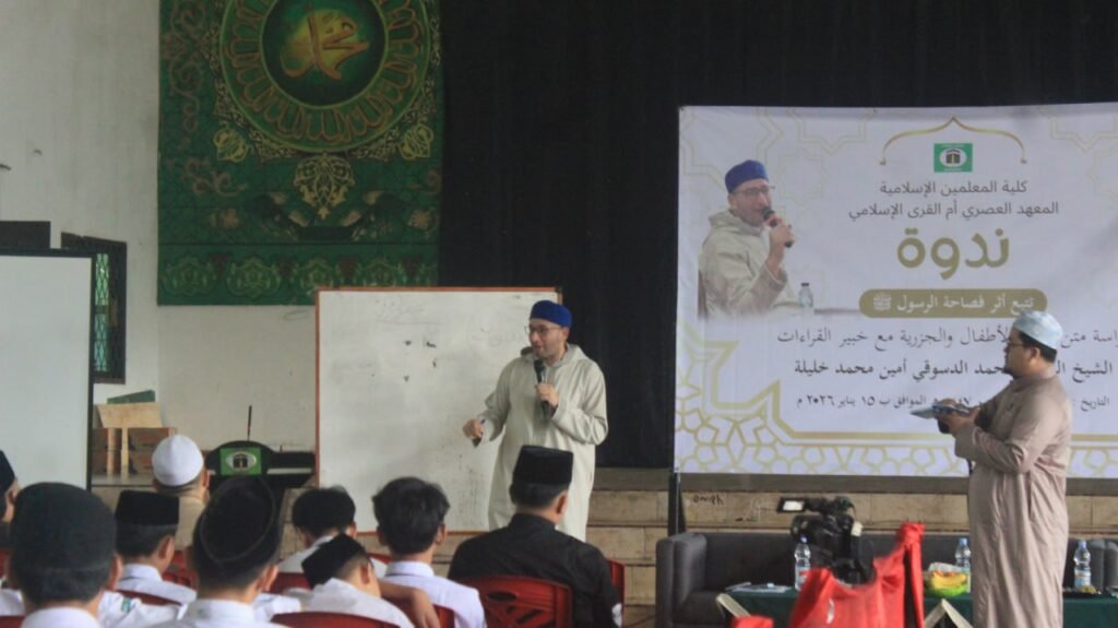 PMUQI — Program KMI Pesantren Modern Ummul Quro Al Islami menggelar seminar ilmiah bertema “Meneladani Kefasihan Membaca Al-Qur’an ala Rasul”. Seminar ini menghadirkan ulama asal Mesir, Syekh Dr. Muhammad Ad-Dusuqi Aminmuhammad Khalifah pada hari Kamis (15/01/26) bertempat di Gedung Serbaguna PMUQI.